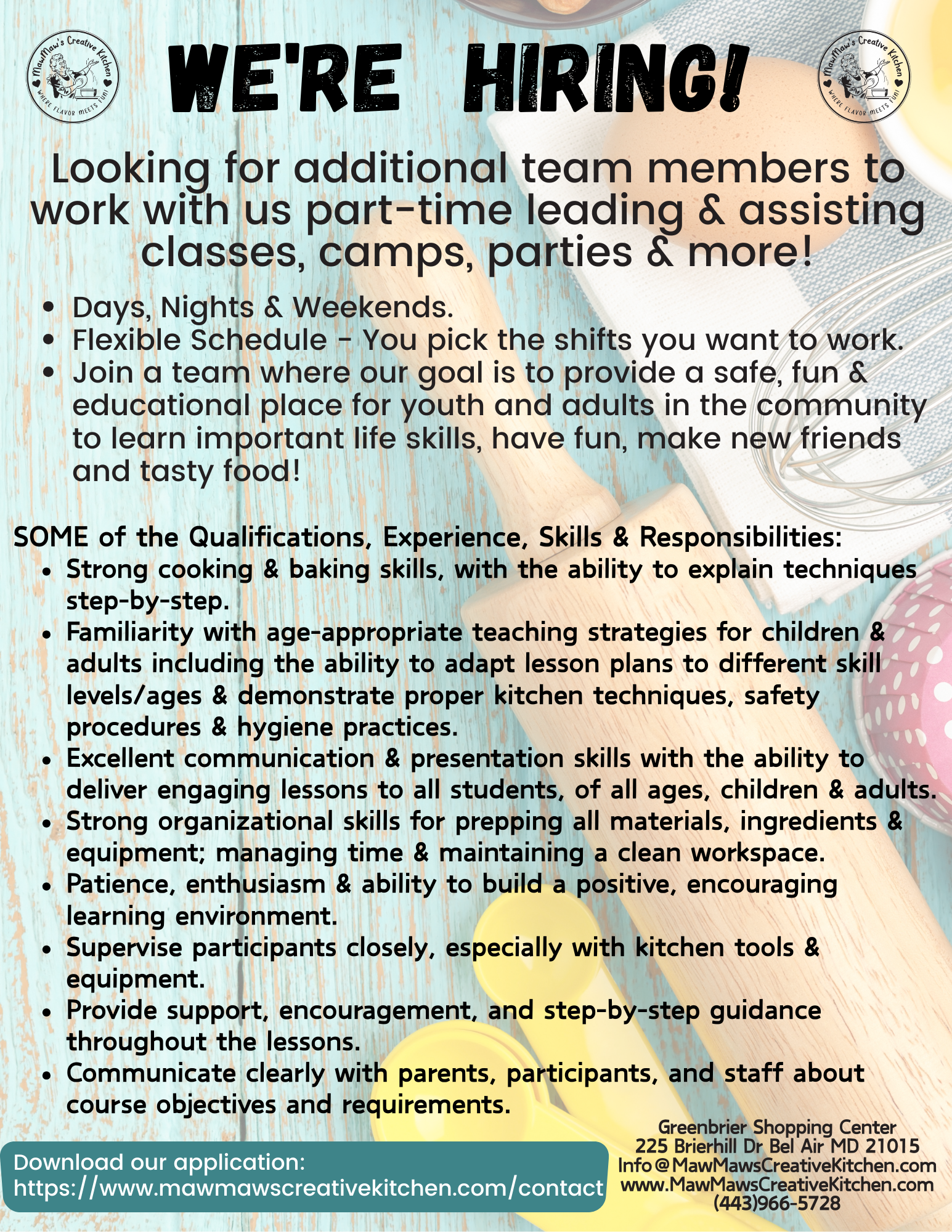 Email us for an application or download it here, complete it and email it to us (Info@MawMawsCreativeKitchen.com) or drop it off it us.